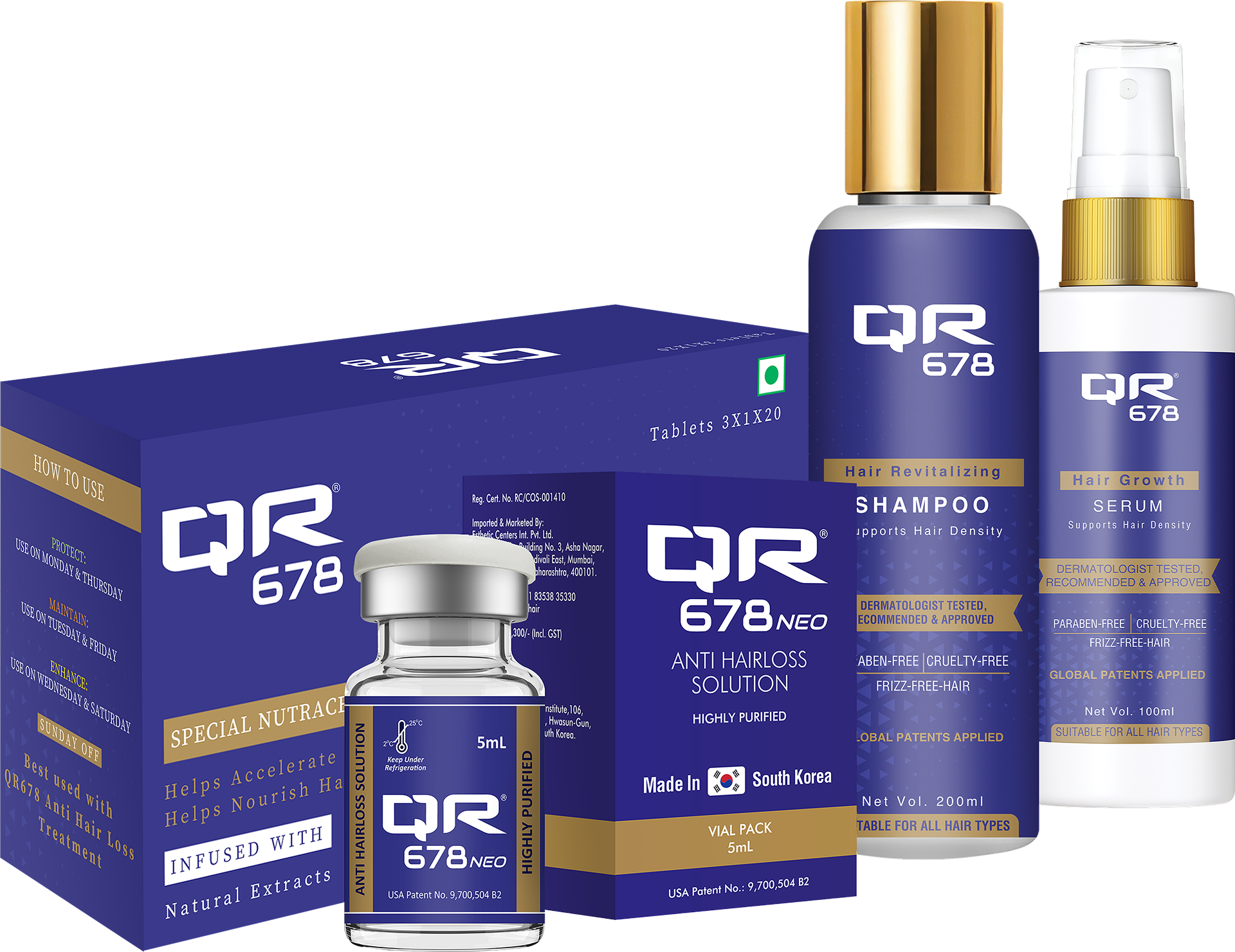 The QR678® research & development platform technology is a proprietary first-in-class technology. This science backed technology is giving rise to multiple products that arrest hair fall and address the thickness, density of hair follicles leading to greater coverage in hair loss. This R&D technology deals with multiple human hair growth related growth factors that are naturally present in our scalp making products derived from these completely natural. Research on this platform technology has resulted in this being awarded USA & Indian patents and has led to over 13+ clinical research papers being published with products derived from this unique technology. The hair growth factors penetrate deep into the scalp and provide nourishment to the scale. Unlike other treatments that contains harmful medication, products derived from QR678® are almost completely devoid of side effects.
